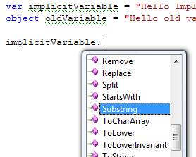 Hence - in the following screen shot - intellisense for the string datatype members is available for the variable implicitVariable, but not for the variable oldVariable - which is of type object.