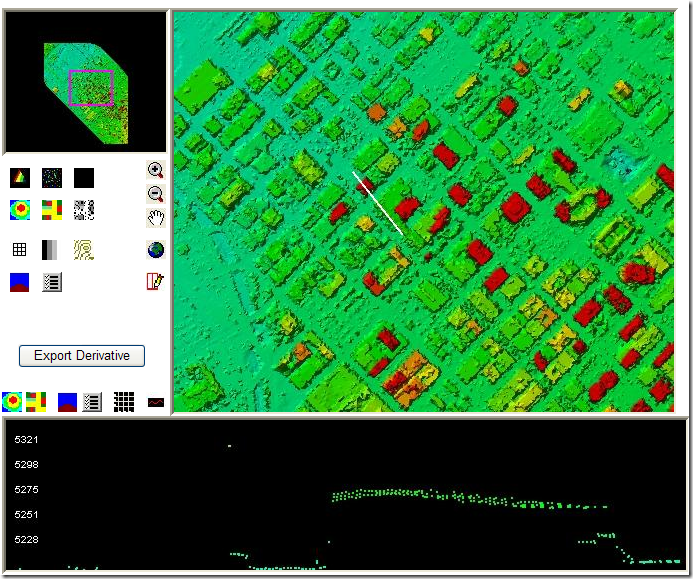 LidarServer is still a prototype and is sort of clunky - but the concept is truly ground breaking. The idea of hosting of LIDAR data on a central server is not new - USGS Click is one such service. But being able to interact with the data itself and in addition to be able to save derivative products from the original data - is new and I don't think has been done before.