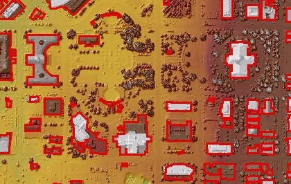 Building footprints (red) shown on top of the hill-shaded last return DEM. Buildings were auto-magically extracted from first and last return DEMs. (LIDAR Analyst is a plugin that works with ArcMAP and Erdas Imagine).